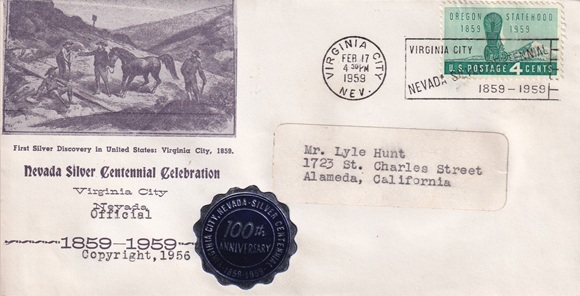 ![]() | Special machine slogan cancellation: "VIRGINIA CITY, NEV. FEB 17 1959 | VIRGINIA CITY NEVADA SILVER CENTENNIAL 1859 - 1959 | ". |