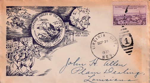 ![]() | Hand cancellation: "VIRGINIA CITY, NEV. SEP 26 1935 ( 1 )". |