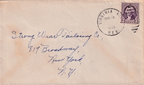 ![]() | Hand cancellation: "VIRGINIA CITY, NEV. MAR 10 1936 ( 1 )". |