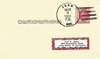 | Two different hand cancellations: "GOODSPRINGS RUR. STA., JEAN, NEVADA AUG 27 1965", and "GOODSPRINGS RUR. STA., JEAN, NEVADA AUG 27 1965". |
