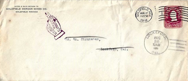 ![]() | Machine cancellation: "GOLDFIELD, NEV. AUG 17 1911 ( 1 ) ( D )". Has "RETURNED TO WRITER" auxiliary marking. |