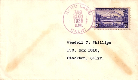 | Hand cancellation: "ECHO LAKE, CALIF. AUG 15 1938". |