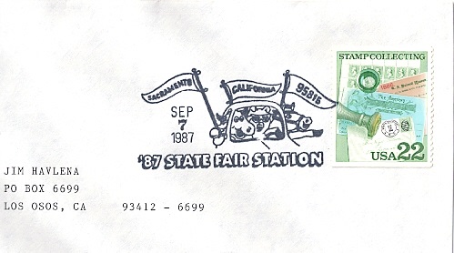 | Special hand pictorial cancellation: "'87 STATE FAIR STATION, SACRAMENTO, CALIFORNIA 95815 SEP 7, 1987". |