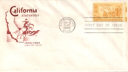 | Machine commemorative pictorial & slogan cancellation: "SACRAMENTO, CALIF. AUG 7 1950 | CALIFORNIA STATEHOOD CENTENNIAL 1850 . 1950 |". |