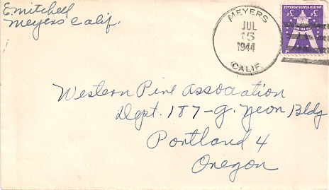 | Hand cancellation: "MEYERS, CALIF. JUL 15 1944". |