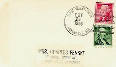 | Hand cancellation: "MEYERS RUR. STA., TAHOE VALLEY, CALIF. OCT 11 1958". |