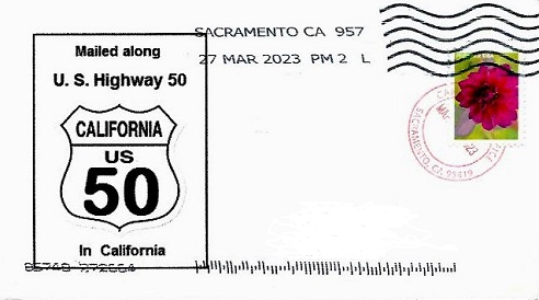 | Hand cancellation: "CAMELLIA POST OFFICE, SACRAMENTO, CA 95819 MAR 27 2023". |