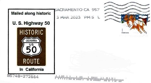 Here are postal cancellations from post offices along U. S. Highway 50 in California. U. S. Route 50 has received several nicknames including "The Backbone of America" and "The Loneliest Road in America". U. S. Highway 50 was one of the original U. S. numbered highways established in 1926. Historically, its longest alignment stretched from Ocean City, MD, to San Francisco, CA. However, in 1964 the segment south and west of Sacramento, CA, to San Francisco, was decommissioned. That original alignment is now called Historic U. S. Highway 50. Today the highway extends west from Ocean City, MD, to West Sacramento, CA.