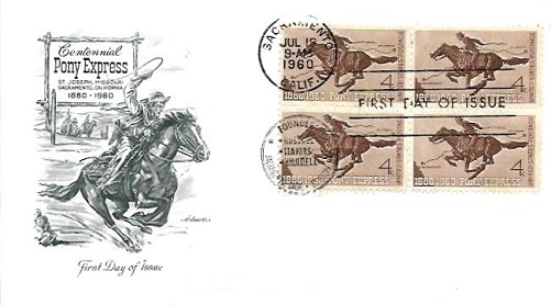 | Special machine slogan cancellations: "SACRAMENTO, CALIF. JUL 19 1960 ( FOUNDERS .RUSSELL .MAJORS .WADDELL SACRAMENTO, CALIF - ST. JOSEPH, MO. ) | FIRST DAY OF ISSUE |". |