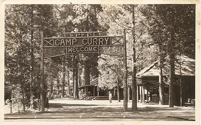 | [No printed text. "Camp Curry. Welcome." on entrance gate]. Real photo postcard. Publisher not given. Unused. Probably circa 1930s. |
