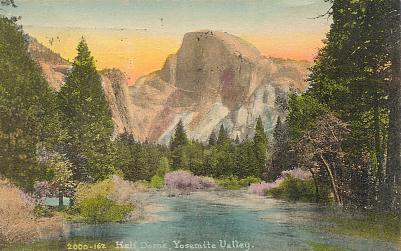 | "Half Dome, Yosemite Valley, California". Hand colored printed postcard. Published by Sunny Scenes, Inc., Winter Park, Fla. Number 2000-162. Postmarked 1934. |